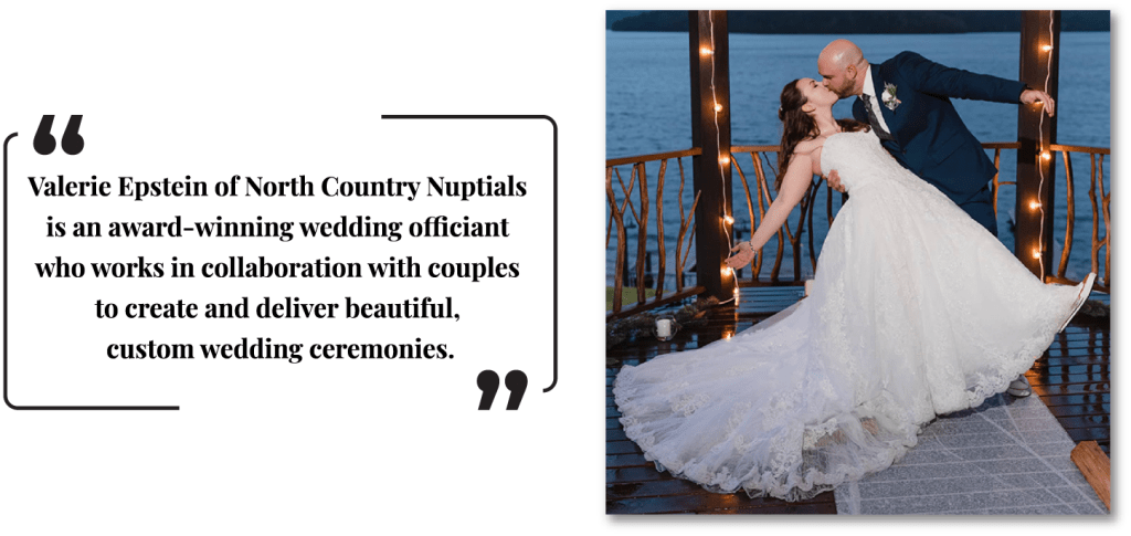 Valerie is not your average wedding officiant! She will enthusiastically help you plan your perfect ceremony. Whether it’s a romantic elopement or a large formal affair, she has you covered. Valerie will take the time to get to know you and will create an engaging customized ceremony specifically tailored to you. Valerie is highly professional and a favorite of many popular Adirondack wedding venues. If you are looking for a ceremony that you and your guests will remember for years to come, contact Valerie for a free consultation.